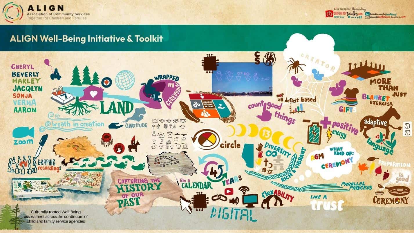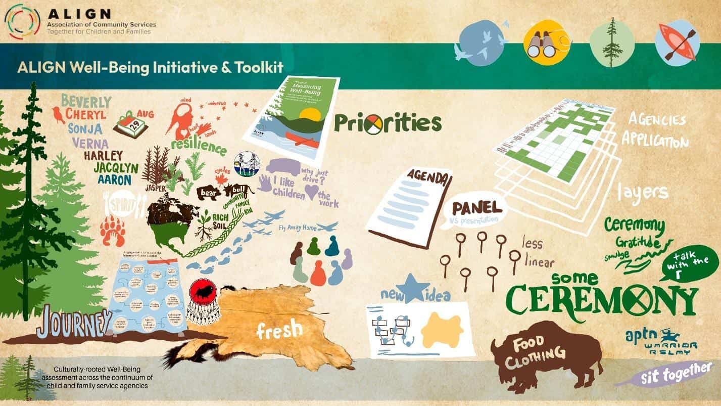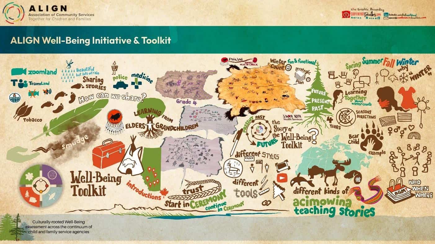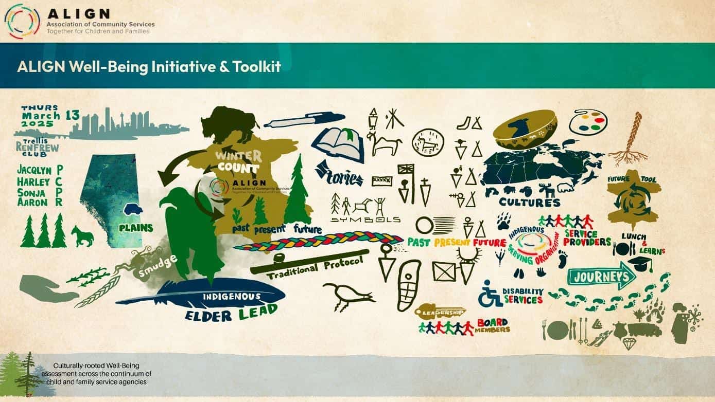 For those unfamiliar, ALIGN’s Well-Being Toolkit is a principle-based, culturally rooted framework designed to help child and family service agencies assess well-being and the impact of their work. What makes it unique is its foundation in Indigenous ways of knowing and being. It creates space for parallel process—where agencies can introduce and maintain cultural practices that enhance well-being across seven key domains.